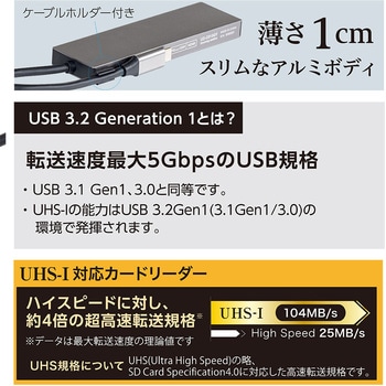 用途ノートPCに便利!付属品取扱説明書・保証書適合【カードリーダー対応スピードクラス】~Class10、UHS-1電源バスパワー本体質量(g)60対応OSWindows10、8.1、8/ChromeOS/macOS10.12以降/iPadOS13.4以降/ Android8以降(ホスト機能搭載機器)対応機種USB Type-Cポートが正常に動作するパソコン、タブレット、スマートフォン本体寸法(幅W×奥行D×高さH)(mm)116×38×11保証期間1年対応メディアSD(HC、XC)、microSD(HC、XC)ケーブル長(cm)50RoHS指令(10物質対応)対応映像出力【HDMI】最大4K/30Hz(HDCP 1.4)転送速度(Gbps)最大5(理論値)最大供給電流(mA)720最大供給電圧(V)5最大電力(W)【PD】100インターフェイス-アップストリーム(PC側)USB Type-C オスインターフェイス-ダウンストリーム(接続機器側)USB Type-Aメス×2、Cメス×1(Alt mode非対応)、HDMI タイプA メス×1USB規格USB3.2Gen1(3.1Gen1/3.0)内容量1個