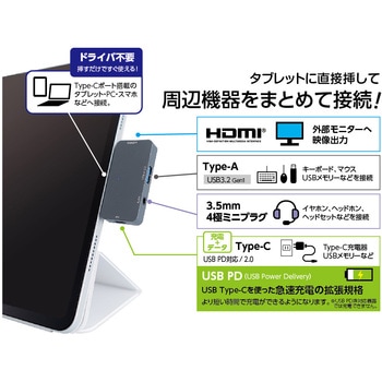 用途タブレットに直接挿せるコンパクトドッキングステーション付属品取説(パッケージ台紙裏面)電源バスパワー本体質量(g)22対応機種Windows11、10/macOS 10.12以降/ChromeOS/iPadOS13.4以降/Android8以降(ホスト機能搭載機器適合機器USB Type-Cポートが正常に動作するパソコン、タブレット本体寸法(幅W×奥行D×高さH)(mm)58×28×10保証期間6ヶ月映像出力【HDMI】最大4K/30Hz(HDCP:1.4)転送速度(Gbps)最大5(理論値)最大供給電流(mA)720最大供給電圧(V)5最大電力(W)【PD】60インターフェイス-アップストリーム(PC側)Type-C オスインターフェイス-ダウンストリーム(接続機器側)USB Type-Aメス×1、USB Type-Cメス×1(Altanative mode非対応)、HDMI タイプA メス×1、3.5mmオーディオジャック×1オーディオ直径3.5mm 4極ジャックUSB規格USB3.2Gen1(3.1Gen1/3.0)内容量1個