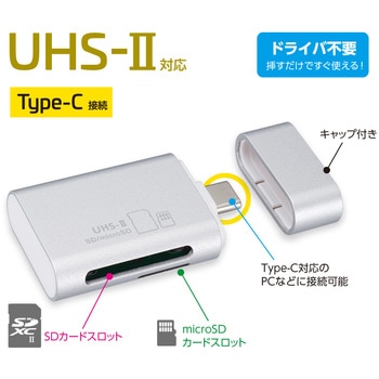 ・コンパクトなType-Cカードリーダーライター・UHS- IIスピードクラス対応・2スロット同時認識、相互コピー可能・美しく強靭なアルミ筐体・コネクタを保護するキャップ付き<ご使用上の注意>※転送速度は理論値。転送速度は、お使いのカードとPCによって変動します。※LightningコネクタのiPadでは使用できません。