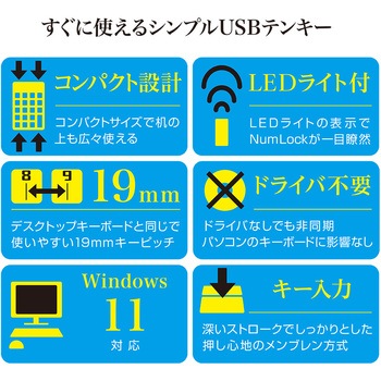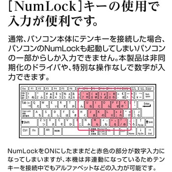 19mmキーピッチ※。使いやすいデスクトップキーボードと同じ間隔です。 ※キーピッチとは、キーの中心から隣接するキーの中心との間隔のこと。メンブレン方式採用。ストロークが長く、深くて確実な入力が得られます。LEDライトの表示でNumLockが一目で確認できます。コンパクトサイズで机の上も広々使えます。使用頻度が高く、計算に便利な00キー。NumLock非連動機能搭載。<ご使用上の注意>Windows専用。