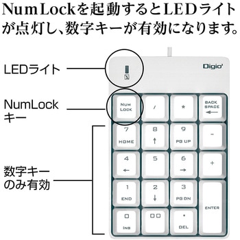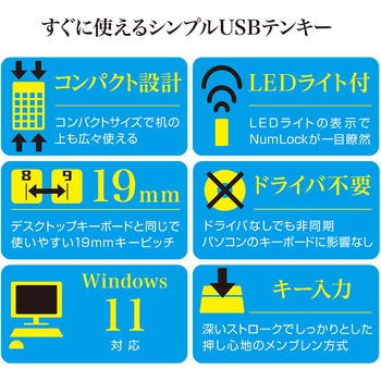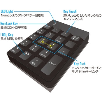 19mmキーピッチ※。使いやすいデスクトップキーボードと同じ間隔です。 ※キーピッチとは、キーの中心から隣接するキーの中心との間隔のことです。メンブレン方式採用。ストロークが長く、深くて確実な入力が得られます。LEDライトの表示でNumLockが一目で確認できます。コンパクトサイズで机の上も広々使えます。使用頻度が高く、計算に便利な00キー。NumLock非連動機能搭載。<ご使用上の注意>Windows専用。