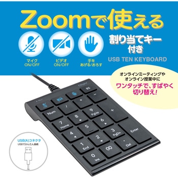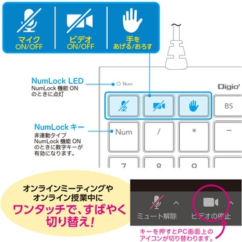 マイクON/OFF・ビデオON/OFF・挙手といった割り当てキー付きオンラインでのミーティングや授業中にワンタッチですばやく切り替え隣り合うキーに指が触れにくいキーピッチ。USB接続ですぐにつかえます。反対側ポートにも接続できる約80cmケーブル長NumLock非連動タイプ<ご使用上の注意>MacOSには対応していません。「割り当てキー」はZoom専用です。