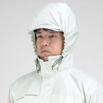 作業用ヘルメットの上からもしっかり被れるヘルメット対応型フードです。ヘルメットを被らない時もサイズ調整により頭にフィットします。