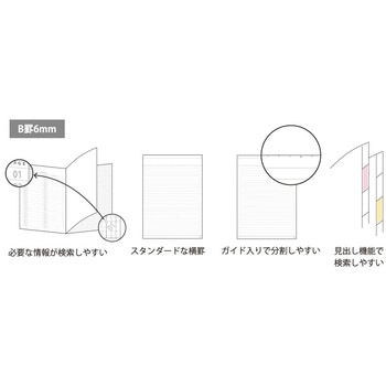 ・インデックスとページ番号で書いた情報が検索しやすい。・見出し機能付きで情報を整理し、検索しやすい。・計画方眼罫→数字入り方眼罫で時間管理しやすい・6mmB罫→ガイド入りで分割しやすい