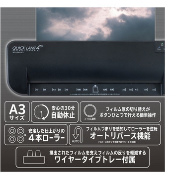 75~250μmの幅広いフィルム厚に対応安定した仕上がりの4本ローラー搭載モデルフィルムづまりを感知してローラーを逆転、オートリバース機能安心の30分自動休止フィルムの反りを軽減するワイヤータイプトレー付属フィルム厚の切り替えがボタンひとつで行える簡単操作