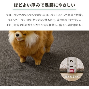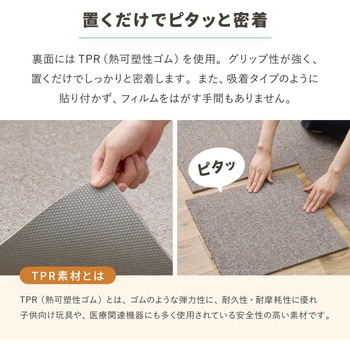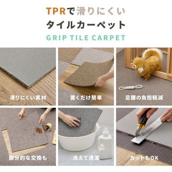 用途ペットが走りまわったりする床に。置くだけでピタッと密着するTPR素材を使用しており、吸着タイプのように貼り付かず、フィルム剥がしも不要。程よい厚みとクッション性があり、足腰への負担をやわらかく軽減。滑りにくいため、フローリングでの不安定さが気になるペットの足元対策としても取り入れやすい仕様です。汚れた場合は洗えて清潔に保ちやすく、毎日使ってもへたりにくい丈夫さもポイント。落ち着いたベーシックカラーとミックス調の色合いで、毛や汚れが目立ちにくく、リビングなど人とペットが一緒に過ごす空間にも自然になじみます。カット調整もでき、ケージ周りや通り道にも使いやすく、必要な場所に、必要な分だけ敷いて使えるタイルカーペットです。仕様●ホットカーペット:非対応●洗濯:手洗いOK●滑り止め:あり厚さ(mm)8色グレー寸法(cm)【50枚組】4.5帖 約40×40cm機能滑りにくい組成表面:ポリプロピレン 、 裏面:TPR(熱可塑性ゴム)内容量1個(50枚)