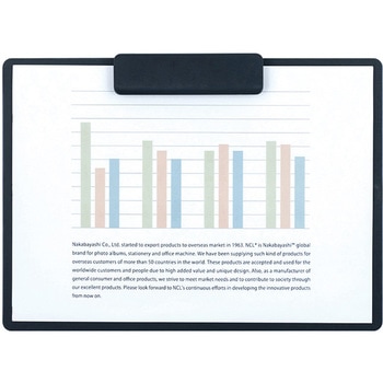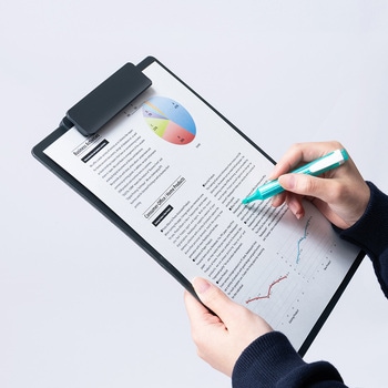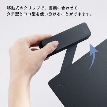 移動式のクリップがついたタテヨコ兼用のクリップボードです。書類に合わせてタテ型とヨコ型を使い分けることができます。開け閉めがしやすいワイドクリップカバー付きの綴具を採用しました。2.8mmの極厚ボードで、立ったままでの筆記でもたわみにくく、しっかりと書き込めます。コピー用紙を最大30枚はさむことができます。