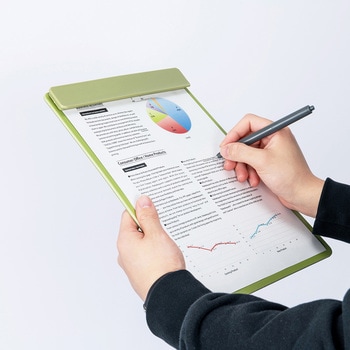 ワンステップで自立する、スタンド機能付きのクリップボードです。