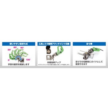 電源が取れない現場でもすぐに作業したい方にオススメです。負荷時でも360°回転します。圧倒的な切断回数(1充電あたりの切断回数:D1鉄/540カット、D2ステンレス/550カット)チップソーなどと違い火花と切粉が出ないです。端材が置台として使えます。使いやすい首折れ式のため手首の疲労を軽減します。工具レスで簡単アタッチメント交換定寸での切断時にガイドとして使用できます。
