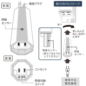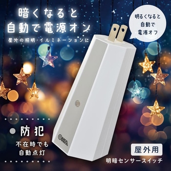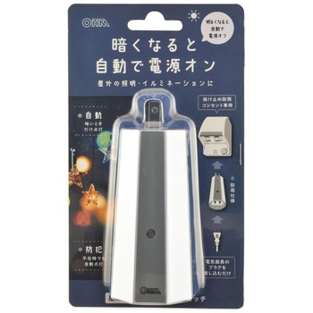周囲の明るさを検知して自動で電源のオン・オフを切り替え照度切替スイッチ付きで点灯タイミングを選択可能屋外照明やイルミネーションの自動制御に最適抜け止め防雨コンセント専用で屋外使用に対応節電対策や防犯用途にも活躍