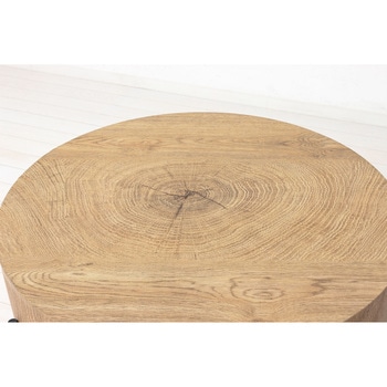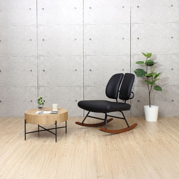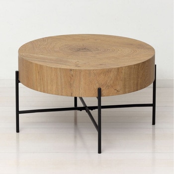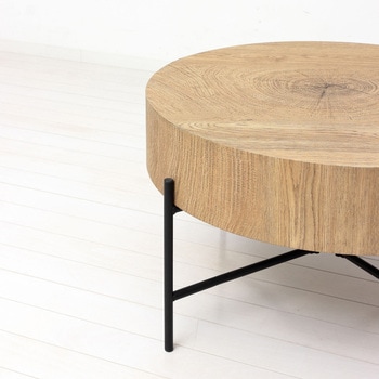 天厚約12cmと重厚感があります。天板の個性的な木目柄が天然木のような温もりを演出します。デザイン性が高くお部屋のアクセントになります。木目調の天板とスチール脚の組み合わせがスタイリッシュ。直径約63cmとコンパクト、狭いスペースにも設置できます。圧迫感がなく柔らかい印象のラウンド型。脚裏はキズ防止の樹脂キャップがついています。お部屋に合わせやすいナチュラル色。