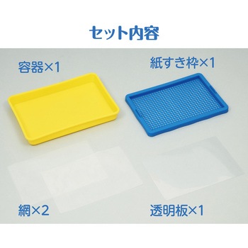 セット内容紙すきセット(容器×1、紙すき枠×1、網×2、透明板×1)×10材質容器・紙すき枠:PP、網:PE、透明板:PET寸法(mm)容器:約182×130×23内容量1セット(10個)