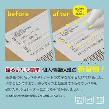 見られたくない個人情報がなぞると消える!感熱紙専用字消しペン破るよりも簡単 個人情報保護の新習慣!感熱紙の宛名ラベルやレシートの文字をなぞるだけで無色化し、消すことができます。塗ってそのまま廃棄できるのでラベルを破いたり、シュレッダーにかける手間がありません。※お住まいの地域の条例に従って廃棄してください。