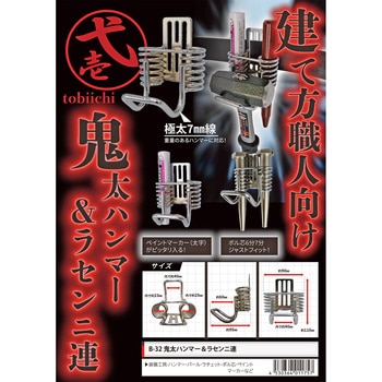 ハンマー収納部は極太線材7mmを使用し、重量ハンマーも収納でき超頑丈仕様!ペイントマーカー(太字)もピッタリ入る。ラセン状の収納部には、ボル芯6分・7分がジャストフィットで収納可。ベルト通しは、細幅2つ穴タイプ。