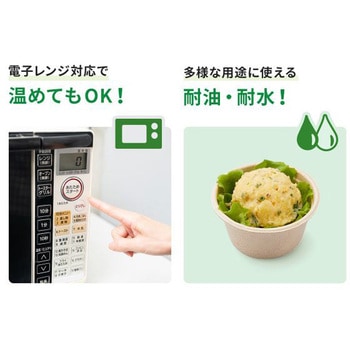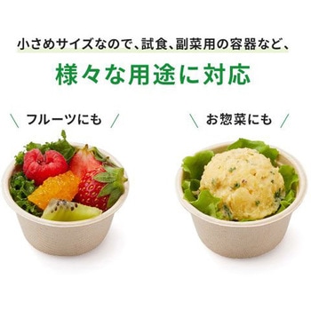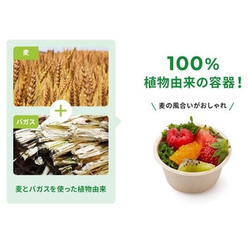 麦の非可食部とバガス(サトウキビの搾りかす)の混合素材からできた、植物由来の業務用・使い捨て小型カップです。容器表面にラミネート加工をしているため、耐油耐水性があり、ドレッシングや味移りを防ぎたい副菜やフルーツを入れて使うことが出来ます。ランチボックスに入るサイズ感で、テイクアウトにもピッタリです。試食・試飲カップとしても使用できます。