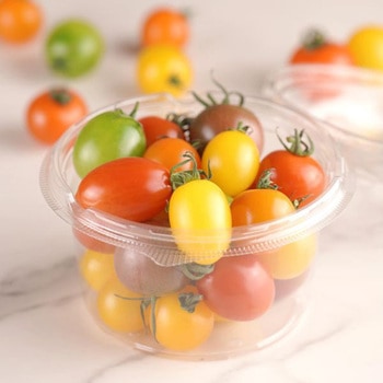 トマト・ブドウ・マスカットにおすすめの丸型青果容器。空気循環が良く、段積みしても鮮度を保ちます。一体型で作業性の効率化・在庫管理しやすさアップ。量目ごとに適したサイズ展開。