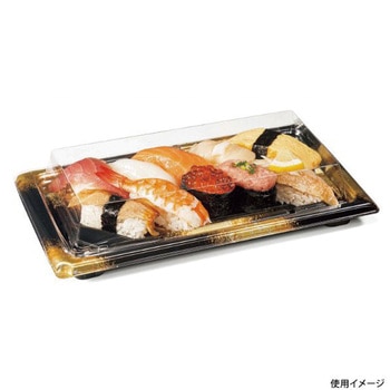 高質感ある高下駄形状の10貫用寿司容器。蓋が外れにくく、ネタ・シャリ共に乾き低減効果のあるスマート勘合で作業効率UPと美味しさキープ。容器の内壁・細溝・溝を埋める勘合位置で寿司転びを抑制し、売場やマイバッグでも美しい盛付けをキープします。「松」の位置づけにふさわしい明るい金と黒の配置で寿司の見栄えを高める定番の黒金柄。おすすめメニューは松握り盛合わせ。