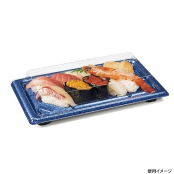 高質感ある高下駄形状の10貫用寿司容器。蓋が外れにくく、ネタ・シャリ共に乾き低減効果のあるスマート勘合で作業効率UPと美味しさキープ。容器の内壁・細溝・溝を埋める勘合位置で寿司転びを抑制し、売場やマイバッグでも美しい盛付けをキープします。鮮度感のある鮮やかな紺色ときらめく銀が特別感を演出します。高売価メニューに最適。おすすめメニューは特松握り。