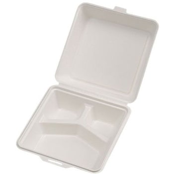 仕切りで3つのスペースに区切られた底深でボリュームたっぷりにご使用いただけます。一体折容器で、単品メニューにも、お弁当にも!幅広いメニューにご使用ください。 パルプモールド(紙)で出来たシャープなデザインのランチボックスです。 特殊モールド製法により両面を滑らかにすることで紙粉が出にくく、内側CPPラミ加工により、耐油性、防水性があります。電子レンジ対応です。 フタの縁が内側に落ちているので汁もれしにくい設計です。本体と蓋の境目に切り取り線があり、切り離しができます。