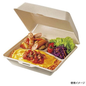 仕切りで3つのスペースに区切られた底深でボリュームたっぷりにご使用いただけます。一体折容器で、単品メニューにも、お弁当にも!幅広いメニューにご使用ください。 パルプモールド(紙)で出来たシャープなデザインのランチボックスです。 特殊モールド製法により両面を滑らかにすることで紙粉が出にくく、内側CPPラミ加工により、耐油性、防水性があります。電子レンジ対応です。 フタの縁が内側に落ちているので汁もれしにくい設計です。本体と蓋の境目に切り取り線があり、切り離しができます。