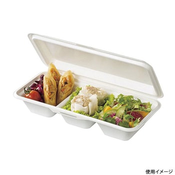 少量の需要に対応した仕切りお惣菜の盛り合わせにぴったり! パルプモールド(紙)で出来たシャープなデザインのランチボックスです。 特殊モールド製法により両面を滑らかにすることで紙粉が出にくく、内側CPPラミ加工により、耐油性、防水性があります。電子レンジ対応です。 フタの縁が内側に落ちているので汁もれしにくい設計です。本体と蓋の境目に切り取り線があり、切り離しができます。
