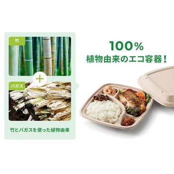 ECO COLLECTION 竹とバガス(サトウキビの搾りかす)の混合素材からできた植物由来の自然にやさしい使い捨て食品容器です。内面PLAフィルム加工でお米が付着しにくいです。業務用50枚入りで展開していた製品をお求めやすい5枚入りで製品化しました。