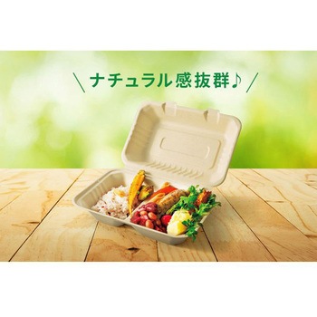 竹とバガス(サトウキビの搾りかす)の混合素材からできた、植物由来の業務用・使い捨てテイクアウトランチボックス。お惣菜など軽食からパスタなどしっかりめのランチまで幅広く活用できます。耐油耐水性、電子レンジにも対応しています。※内側にコーティング加工がされていない為、米飯など粘り気のある内容物を直接入れると、材質の特性により食品に素材が付着する場合がございます。用途に応じて、クッキングペーパーやワックスペーパーを併用頂くと安心してご使用いただけます。