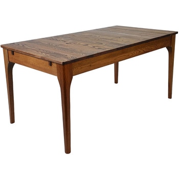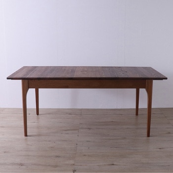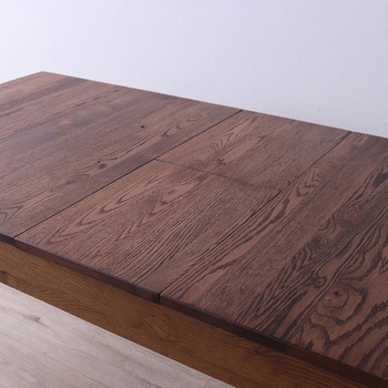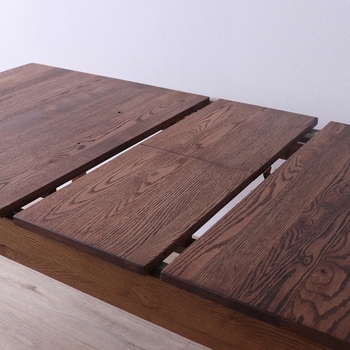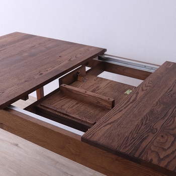 150cmから180cmに拡張できるエクステンションテーブルです。レッドオーク無垢材のモダンなダイニングテーブルです。大人数での使用時に天板を広げられます。組立式です。