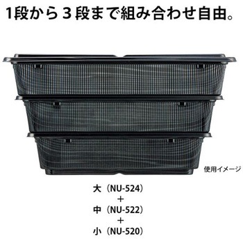 仕出しだけでなく高売価帯のテイクアウトメニューに最適な容器!組み合わせ自由な「大(NU-524)・中(NU-522)・小(NU-520)」3サイズをラインナップしており、用途に応じた使い方が可能です。【※小(NU-520)は蓋がないため、1段式での使用が出来ません】中皿・蓋は別売り。