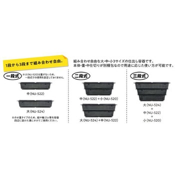 仕出しだけでなく高売価帯のテイクアウトメニューに最適な容器!組み合わせ自由な「大(NU-524)・中(NU-522)・小(NU-520)」3サイズをラインナップしており、用途に応じた使い方が可能です。【※小(NU-520)は蓋がないため、1段式での使用が出来ません】中皿・蓋は別売り。