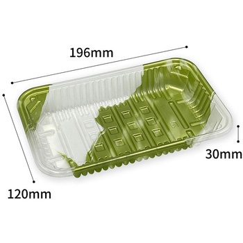 PET素材なのでラップやドリップが必要な商品にもおススメです。濃い色のフードマットにも負けず、年間通して使える緑色。