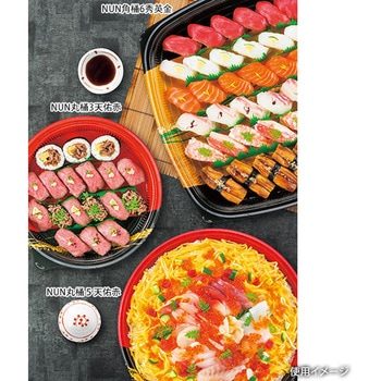 高級感溢れる柄で寿司を引き立てる。「強嵌合」のため、ノンテープが可能でテープコスト削減に繋がります。[寿司桶]3人前/[用途]寿司、刺身盛り合わせ、精肉など。※蓋は別売り。