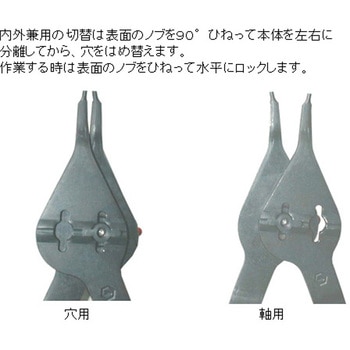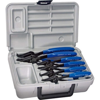 セット点数:7点。セット内容:・EA590MC-1、(6-16mm 兼用スナップリングプライヤー)、・EA590MC-2、(17-23mm 兼用スナップリングプライヤー)、・EA590MC-3、(24-37mm 兼用スナップリングプライヤー)、・EA590MC-21、(6-16mm 兼用スナップリングプライヤ-/90° )、・EA590MC-22、(17-23mm 兼用スナップリングプライヤ-/90° )、・EA590MC-23 、(24-37mm 兼用スナップリングプライヤ-/90° )、・ケース。内外兼用。 先端角度 ストレート×3本、90°×3本。