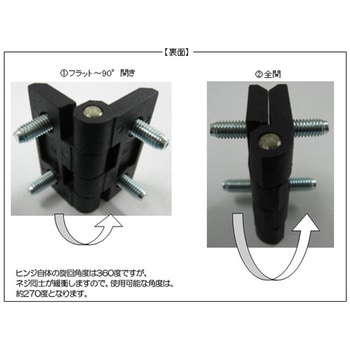 本体に取付ねじ付き。旋回角度:約270°(※ヒンジ自体の旋回角度は360°ですが、ねじ同士が緩衝しますので、ご使用可能な角度は約270°となります)。