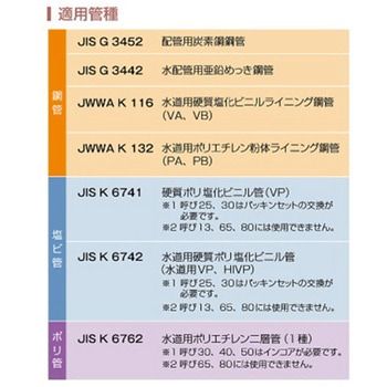 材質本体・ナット:可鍛鋳鉄 (溶融亜鉛メッキ)、ロックリング・カラー:鋼、パッキン:NBR使用温度範囲(℃)-10~60 (水の場合0~40)最高使用圧力(MPa)水・空気・油:1.0 、都市ガス・LPG:0.3適合管【鋼管】配管用炭素鋼鋼管(JIS G 3452)、水配管用亜鉛めっき鋼管(JIS G 3442)、水道用硬質塩化ビニルライニング鋼管(VA・VB)、水道用ポリエチレン粉体ライニング鋼管(PA・PB)【塩ビ管】硬質ポリ塩化ビニル管(VP)、水道用硬質ポリ塩化ビニル管(水道用VP・HIVP)【ポリ管】水道用ポリエチレン二層管(1種)内容量1個