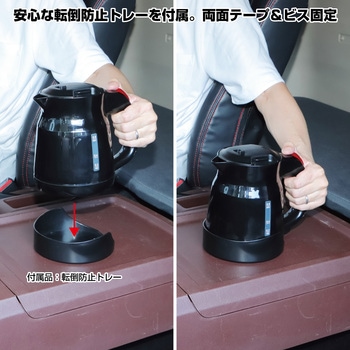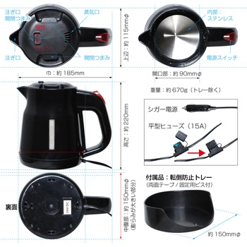 24V車専用のカーケトル。最大容量800ccのお水を約98℃の熱湯になるまで、シガー電源でお手軽に沸騰させます万が一倒れても安心な湯漏れ防止設計。さらに転倒防止トレーの付属お湯が沸くと電源は自動的にOFFになるオートストップ機能、空焚き防止機能搭載開口部が広いのでお手入れも楽々です!