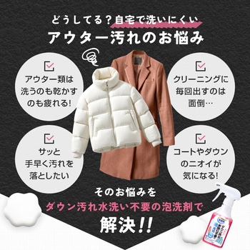 水洗い不要で汚れと臭いを落とす、業務用泡洗剤です。汚れに泡が密着して、サッと拭くだけで簡単に汚れを落とせます。水を使わず手軽に洗浄・消臭できます。普段あまり洗わないダウンやコート、制服などのお手入れに。帽子やカバン・ソファや椅子など、様々な布製品にお使いいただけます。