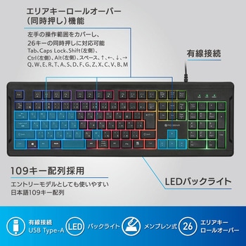 26キー同時押し対応で複数操作も安定して入力可能USB有線接続により遅延が少なく安定した操作性を実現日本語109キー配列でゲームから日常作業まで幅広く対応3色LEDバックライト搭載で視認性とデザイン性を両立チルトスタンド付きで手首への負担を軽減
