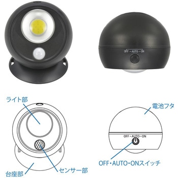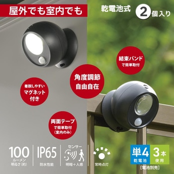 暗くなると人を感知して自動点灯する乾電池式センサーライトIP65相当の防じん・防噴流仕様で屋外設置にも対応マグネット脱着式で、本体を外して懐中電灯としても使用可能特殊レンズ採用により、照射距離を約1.5倍に拡大玄関や通路、防犯対策用の補助照明として活躍