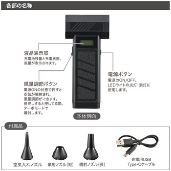 小型ながら強力噴射が可能な充電式エアダスターガス不使用で繰り返し使える環境配慮型設計最大風速約52m/sのターボモード搭載でホコリを一気に吹き飛ばすブラシレスモーター採用で高耐久・安定動作を実現パソコンや精密機器、家庭内清掃まで幅広く対応