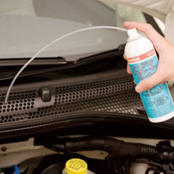 車外のエアーインテーク(ワイパー下の格子状部位)から洗浄剤を注入する方式であり、ジャッキアップの必要もなく簡単に作業できます。