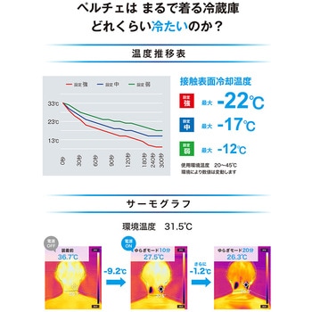 ペルチェは冷蔵庫やワインセラー、美顔器などにも活用されている電子部品で、電源を入れると瞬 時に冷たくなることから、効率的に身体を冷やすことができます。