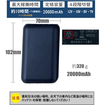 用途働く人(ワークマン)におすすめ / 作業服 / 作業着 / 農作業 / 現場仕事 / アウトドア / ガーデニング / 外作業 / 普段着 / ゴルフ / 釣り / カジュアル寸法(mm)バッテリー:約70×102ブラック、バッテリー:ブラック質量(g)バッテリー:320充電時間(時間)6バッテリー容量(mAh)20000素材ポリエステル内容量1セット