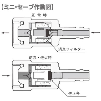 超軽量(40g)超小型で溶断器取付け専用型。圧力低下の少ない外壁阻止構造。ワンタッチ着脱式・手元で逆火防止します。逆火・逆流による熔断ホースの破裂事故を防ぎます。Qジョイント仕様。ミニカプラと互換性があります。酸素・ガスの供給は遮断しませんので必ず乾式安全器(調整器取付型)(別売:EA300-5B)と併用してご使用ください。流量:10m3/h(標準状態)入口圧力0.5MPa、圧損0.15MPaの時。