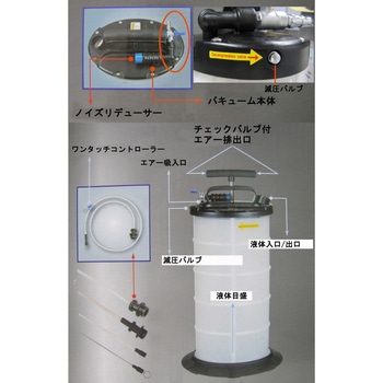 プラグ付き。ノイズリデューサー付き。負圧を開放する減圧バルブ付き。エアー、手動の両方で使えるオイルポンプ。空圧吸入なので、火花が発生しません。適用:エンジンオイル、ギアオイル、ブレーキオイル、水などに。