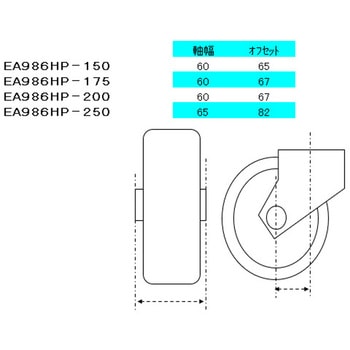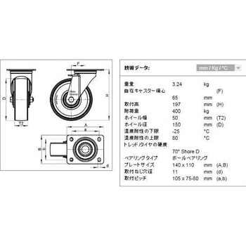 車輪は高荷重・ハイスピードでの使用に耐えられるボールベアリング仕様。自在旋回部内にはダブルボールベアリング付き。ナイロン6製の車輪は、丈夫で耐衝撃性に優れています。プレート取付け型。耐熱温度35℃以上では負荷容量が減少します。