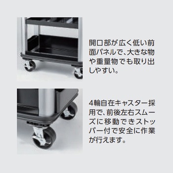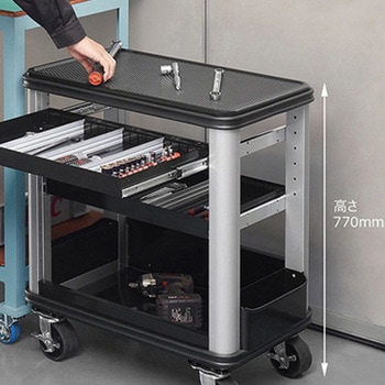 高さ770mmで、より低い位置での作業がしやすい低床モデル。天板の上にケースなどを置くと作業台と高さが揃い、作業性が向上します。天板や支柱など各部にラウンド形状を採用。設備などをキズつけることなく作業が行えます。スプレー缶などの整頓に便利なサイドポケット付き(左右)。モール付きで出し入れ時もキズが付かず、引っ掛かりによるケガを防止します。トレイは取り出しが可能な着脱式。トレイごと作業場所へ移動でき、入れ替えも可能。※トレイは手前側のみ引き出せます。引出しやトレイは、溶剤や薬品に強い塗装を採用しています。開口部が広く低い前面パネルで、大きな物や重量物でも取り出しやすい。柱の内側にはオプションの取付けが可能な穴を設けています。重厚感のあるシルバー×ブラックと細部までこだわったフォルム。2段2引出しタイプ。