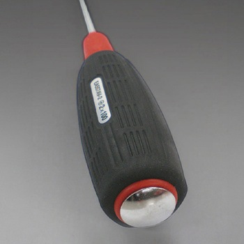 ハンドルは滑りにくく、力の入るスリット形状。グリップエンドは握りやすい六角形状。打撃できる貫通柄。六角軸形状。マグネット付き。