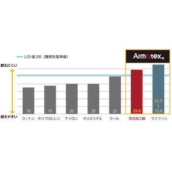高い防炎、難燃性の機能を合わせ持つ商品です。繰り返しの洗濯でも防炎効果が持続します。防炎加工綿:綿100%の生地に特殊な防炎加工を施して生地に防炎性を付与します。ベースとなる綿の着心地や快適性はそのままです。限界酸素指数(LOI値):数値が高いほど難燃性があることを示し、一般的に<26以上>あれば自己消火性があります。通常の綿素材は<18>。