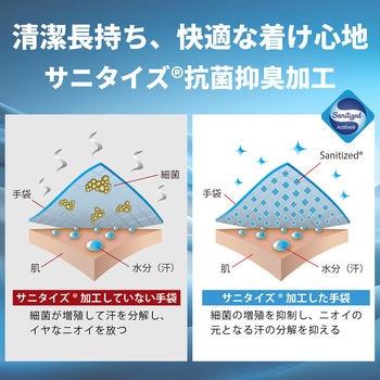 ニトリルゴムをコーティングしているため、油や突き刺し・引っ掻きに強く、耐摩耗性に優れています。マイクロフィニッシュ加工で、油や水にも優れたグリップ力を発揮します。内側にフリースを使用した、あたたかく作業しやすい手袋です。ニオイや菌を抑制する、サニタイズ抗菌抑臭加工を施しています。手首までカバーする袖口ロングタイプで、防寒性に優れています。